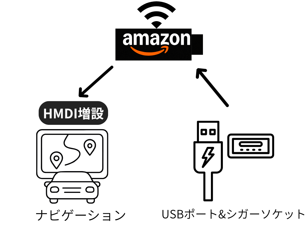 Fire TV Stickを使う場合は、ビートソニックやデータシステムのアダプターでHDMI入力を後付けする必要があります。