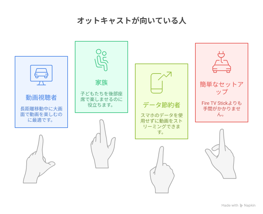子どもが後部座席で退屈しがちな家族ドライブでも、オットキャストがあれば安心です。