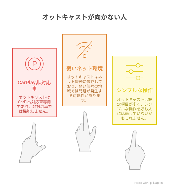 オットキャストはCarPlay扱いのため、アプリは基本的に利用できますが車種によっては制限が残るケースがあります。