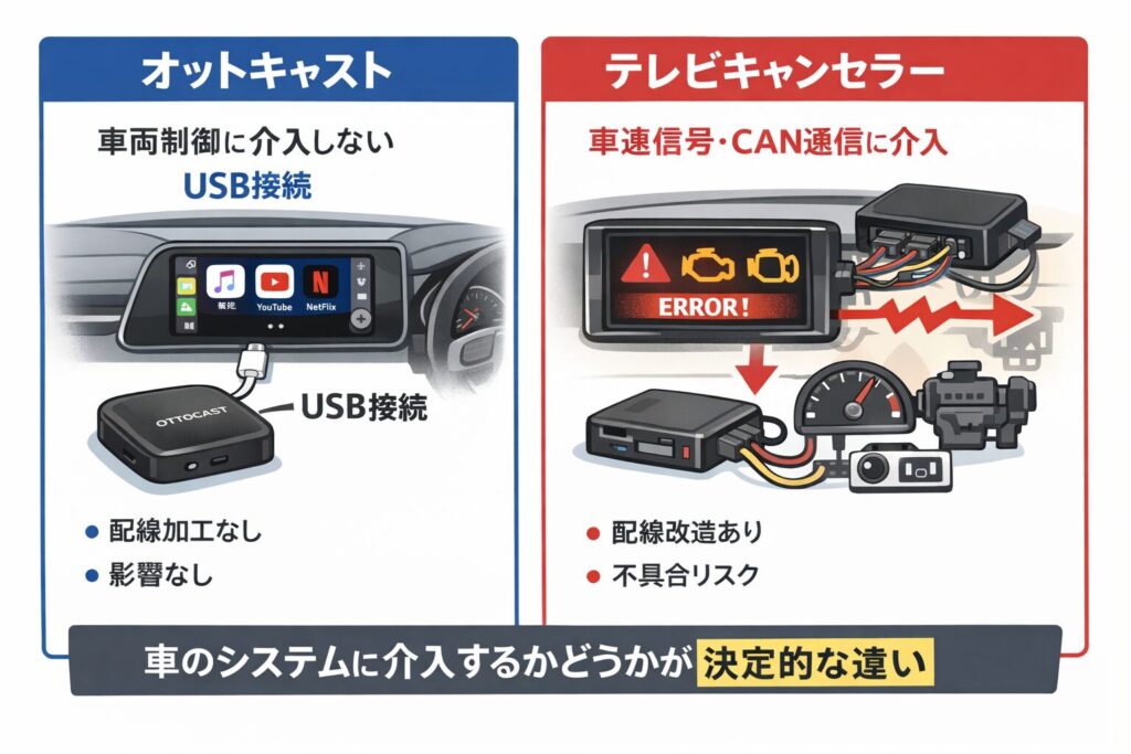 一方、テレビキャンセラーは車速信号やCAN通信に介入する仕組みのため、車両制御への影響が懸念されます。