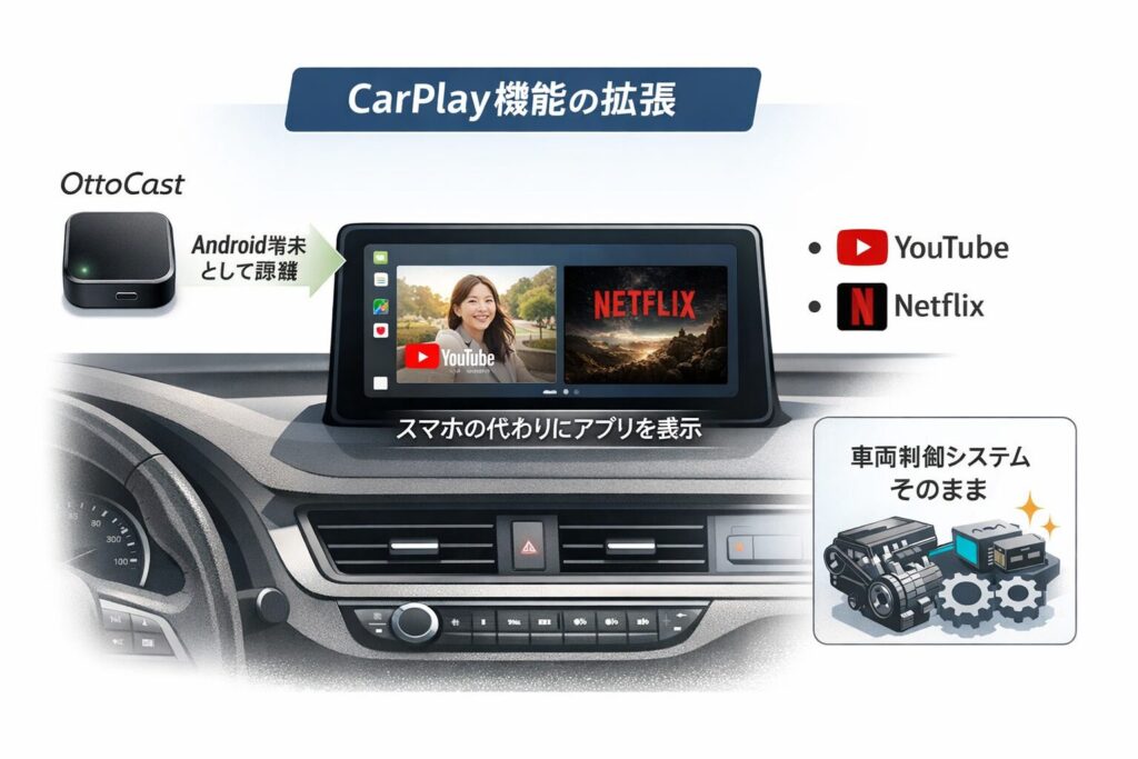 オットキャストの役割は、CarPlayの表示機能を拡張することです。