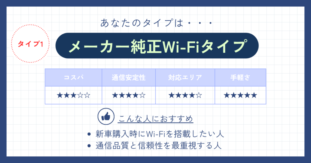 車の設計段階から組み込まれているメーカー純正Wi-Fiは、最も安定性に優れた選択肢です。