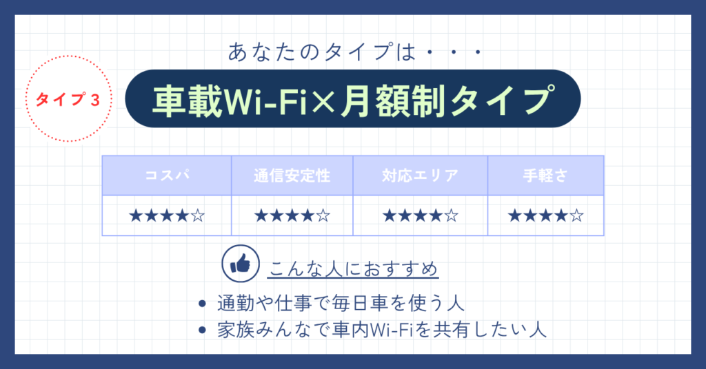 車内で毎日Wi-Fiを使う人には、月額制の車載ルータータイプがおすすめです。